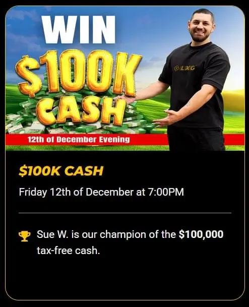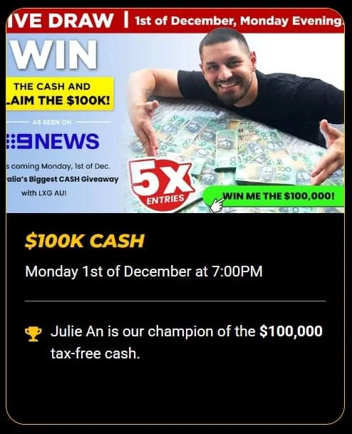 At LXG AU, every entry gives you a real shot at incredible prizes. By joining, you’re getting the opportunity to take home $200,000 TAX-FREE CASH and be part of an exciting experience where one lucky winner walks away with life-changing winnings.